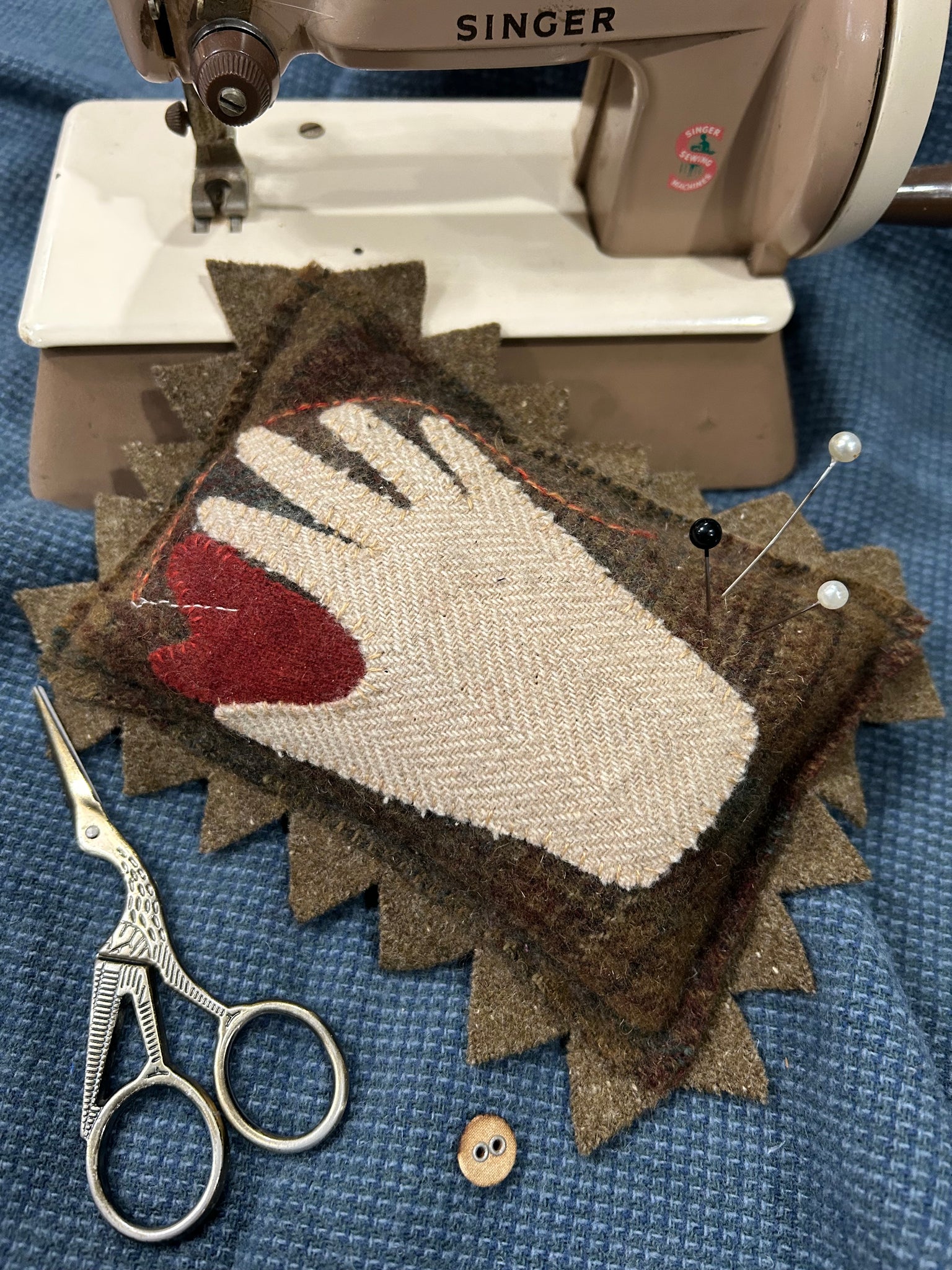 Close at Hand is a primitive pincushion wool applique kit. Kit includes all wool and the pattern. This was originally in my book that is now out of print, "Primitive Style, Folk Art Quilts and Other Finery," by Jeni Gaston...you may be able to find it on eBay, or amazon still though!